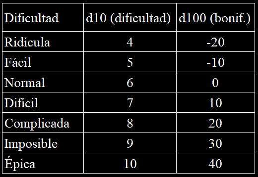 Debido a que las características especiales tan solo pueden tener un valor máximo de 10 puntos estas se rigen por un reglamento ligeramente distinto al de las características comunes. Para tiradas generales de características especiales se utilizarán las dificultades reflejadas en la siguiente tabla: